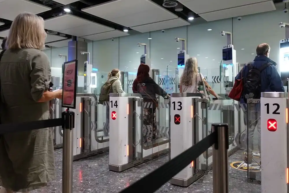 Photo 3 : Septembre 2023, aéroport d'Heathrow, à Londres, les voyageurs aériens franchissent les portes automatiques de contrôle des frontières des passeports. Crédit : 1000 Words pour Shutterstock.