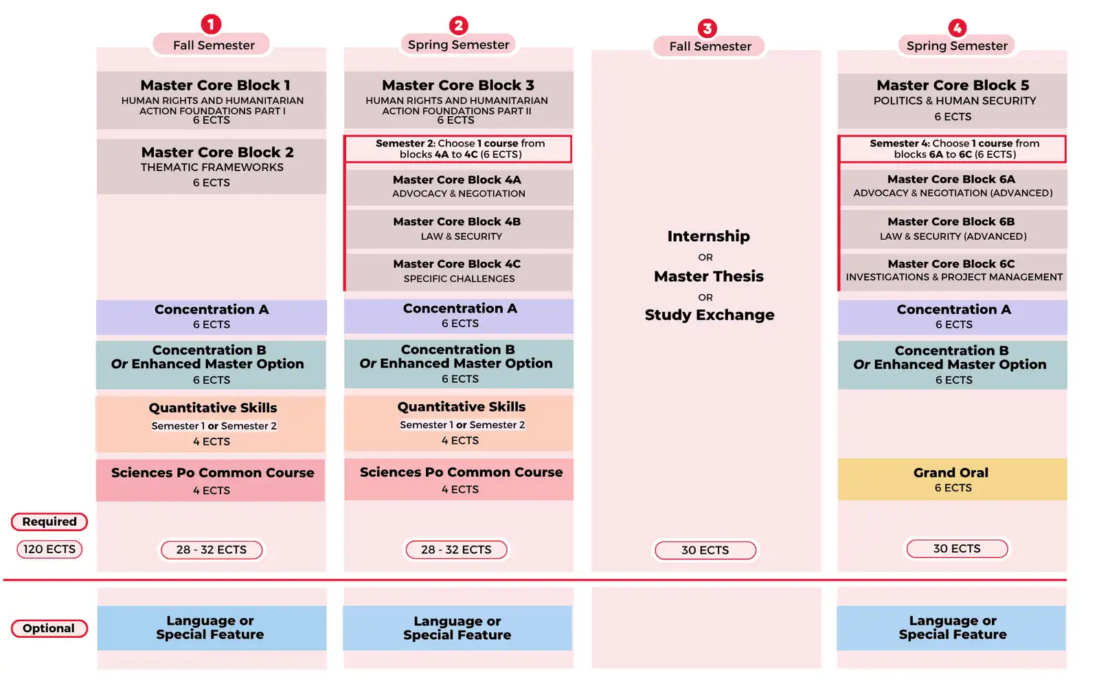 Further details regarding PSIA’s general program structure. If you choose the Enhanced Master option in place of a second concentration, you have to choose one course from a specific list in semester 1, and choose one course in one of the three optional blocks in semesters 2 and 4.