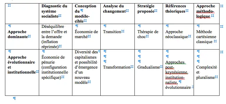 Dès le début des années 1990, des voix s’élèvent contre l’approche dominante de la transition, critiquant à la fois le diagnostic des économies socialistes en 1989, le modèle-cible visé et les programmes de réforme inspirés du consensus de Washington. Elles mettent en garde contre les dangers de la thérapie de choc et proposent une stratégie plus graduelle. Les partisans de cette approche s’inscrivent généralement dans une perspective théorique « hétérodoxe », qu’elle soit post-keynésienne, institutionnaliste et/ou évolutionnaire (Chavance, 1990; Eichler & Zysman, 1990 ; Ellman, 1994 ; Kolodko, 1991 ; Mertlik, 1993 ; Murrell, 1992ab, 1993 ; Stark, 1992).