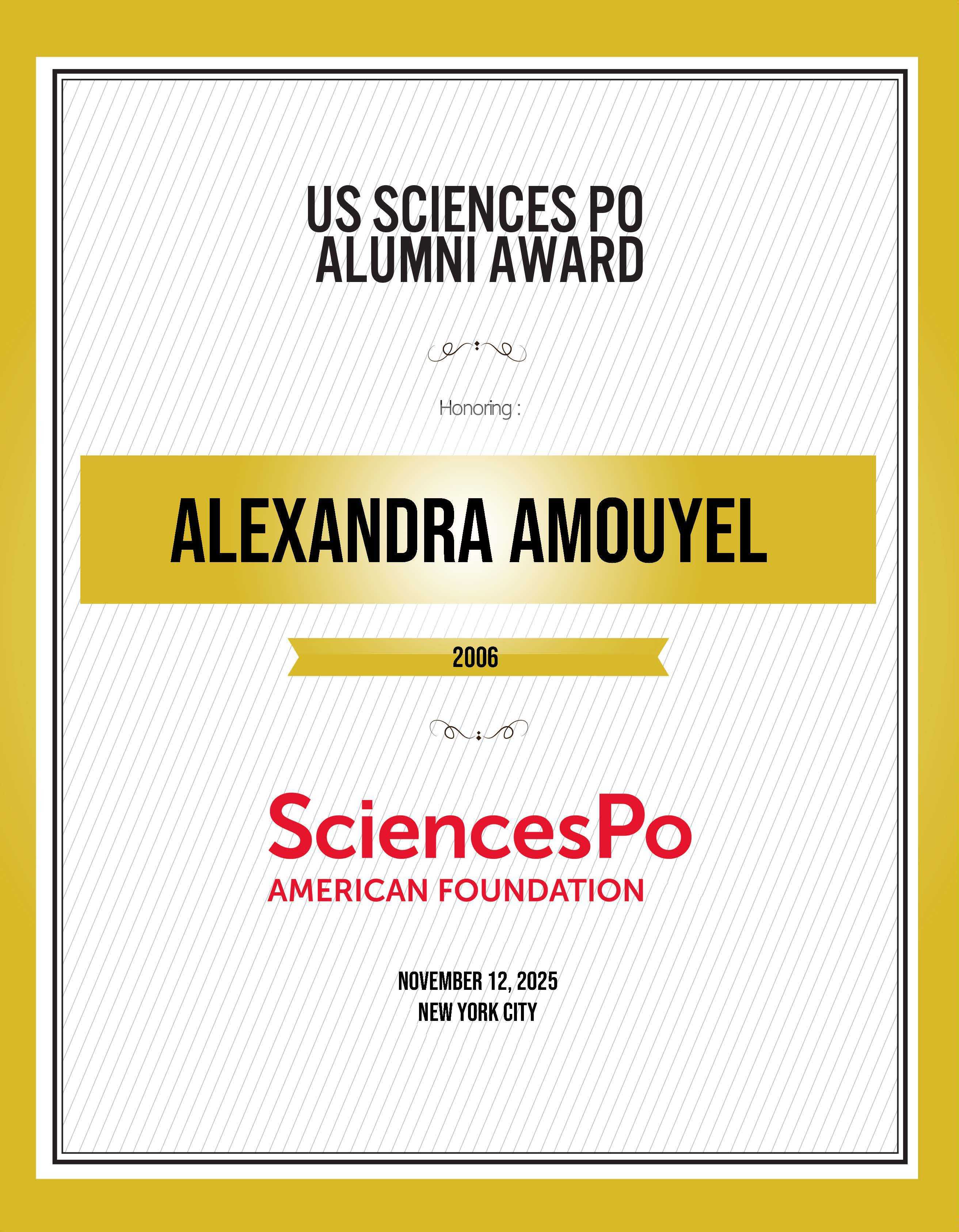 The Sciences Po American Foundation will award the 2024 US Sciences Po Alumni Award to Adriana Diaz (‘09) at the Residence of the French Ambassador in Washington D.C. on November 22, 2024. Members of the Sciences Po community are encouraged to join to recognize and honor Adriana’s embodiment of the values that Sciences Po strives to uphold, while enjoying an opportunity to network and engage with fellow Alumni.