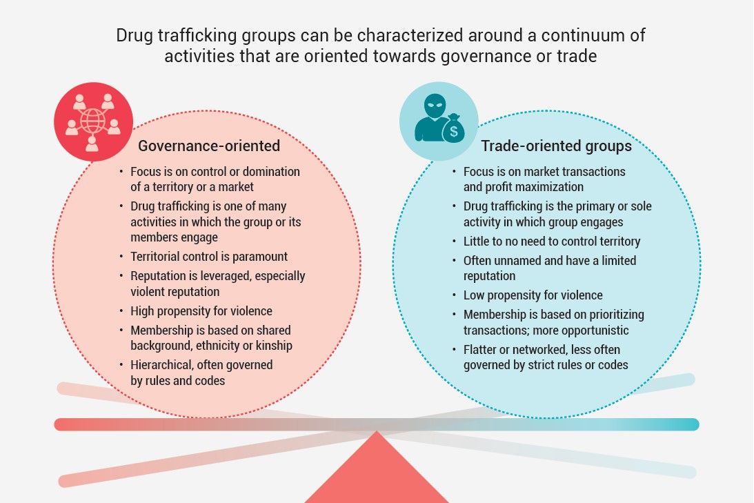 “Organized crime groups that engage in drug trafficking differ greatly in terms of their structure, make-up and goals, with groups generally appearing to be oriented towards trade or towards governance. Those oriented towards trade are generally more agile and prioritize market transactions and profit maximization, whereas those oriented towards governance are found to be more hierarchical and seek to control territories, or the markets and people within them.” (2025 World Drug Report)