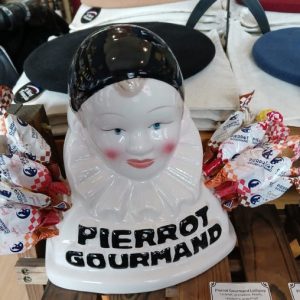 Having written a dissertation and now a book on the Comédie Italienne mask Pierrot, I often receive messages with friends’ and colleagues’ photographs of Pierrot sightings. He is everywhere: knotted into the lace curtains of a flat in Lille, plastered to the wall of a square in Avignon, embedded in contemporary self-portraits in chic galleries, and on the counter of boulangeries and patisseries, where the ceramic bust of “Pierrot gourmand” bears a selection of lollipops stuck out of holes in his shoulders (Figure 1). All of these instances intrigue me, but it is the last one that I want to address here. The theatrical character Pierrot has a sweet tooth (as well as a penchant for wine). In his most buffoonish iterations, he is also silly and childish, a gentle “clown blanc.” For these reasons, it makes sense that Pierrot would be the mascot of the eponymous French candy producer, founded in 1892. Yet there is something further transpiring here, which is embedded in the form of the bust itself, a representation of a person that serves as a case (un étal) for the display of merchandise.