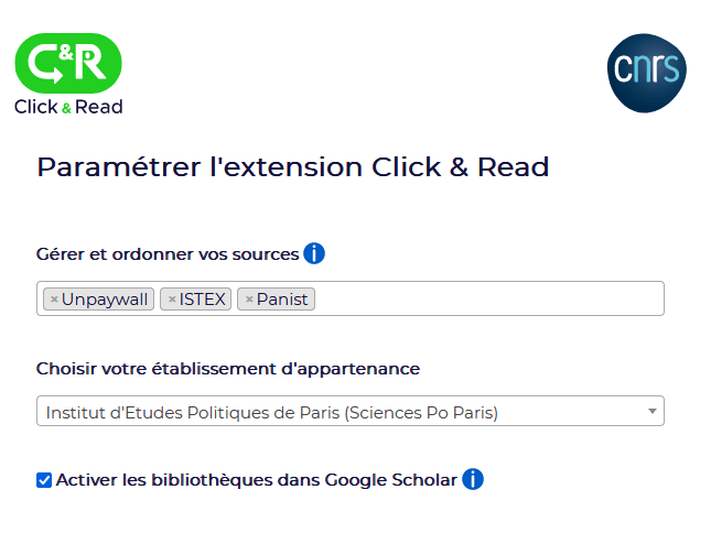 After installation, declare your institution(s) of affiliation and choose the order of the queried sources (in French only).