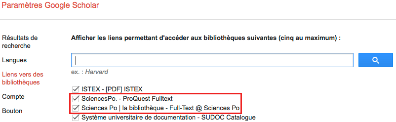 In order to take advantage of the library's subscriptions even when using Google Scholar outside the Sciences Po campus, go to Settings > Library links in authenticated mode.