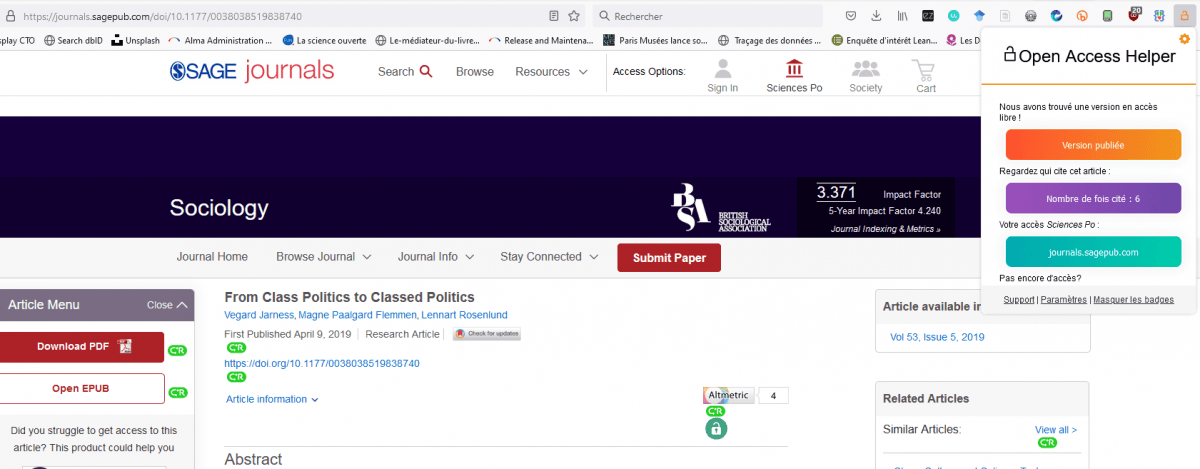 Lean Library pops up when you are viewing a resource that Sciences Po owns or is offering as a test; if not, it will search for an open access version via Unpaywall or offer you other alternatives.
