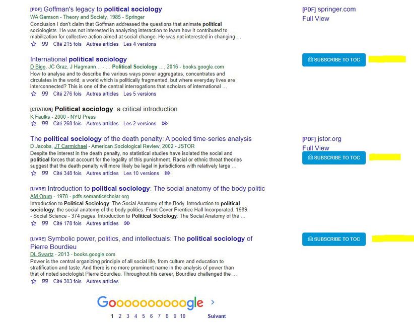 Once installed, the extension will also appear when you search on Google Scholar, in order to receive email alerts on the tables of contents of the journals of your choice, thanks to the Subscribe to TOC button: