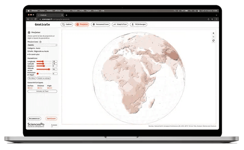 Graticule, application gratuite développée par l'Atelier de cartographie de Sciences Po, permet de créer son propre fond de carte en 5 étapes au cours desquelles l’utilisateur paramètre finement sa projection, son cadrage, le centrage, les couleurs et l’affichage des informations utiles (fleuves, villes, relief…).