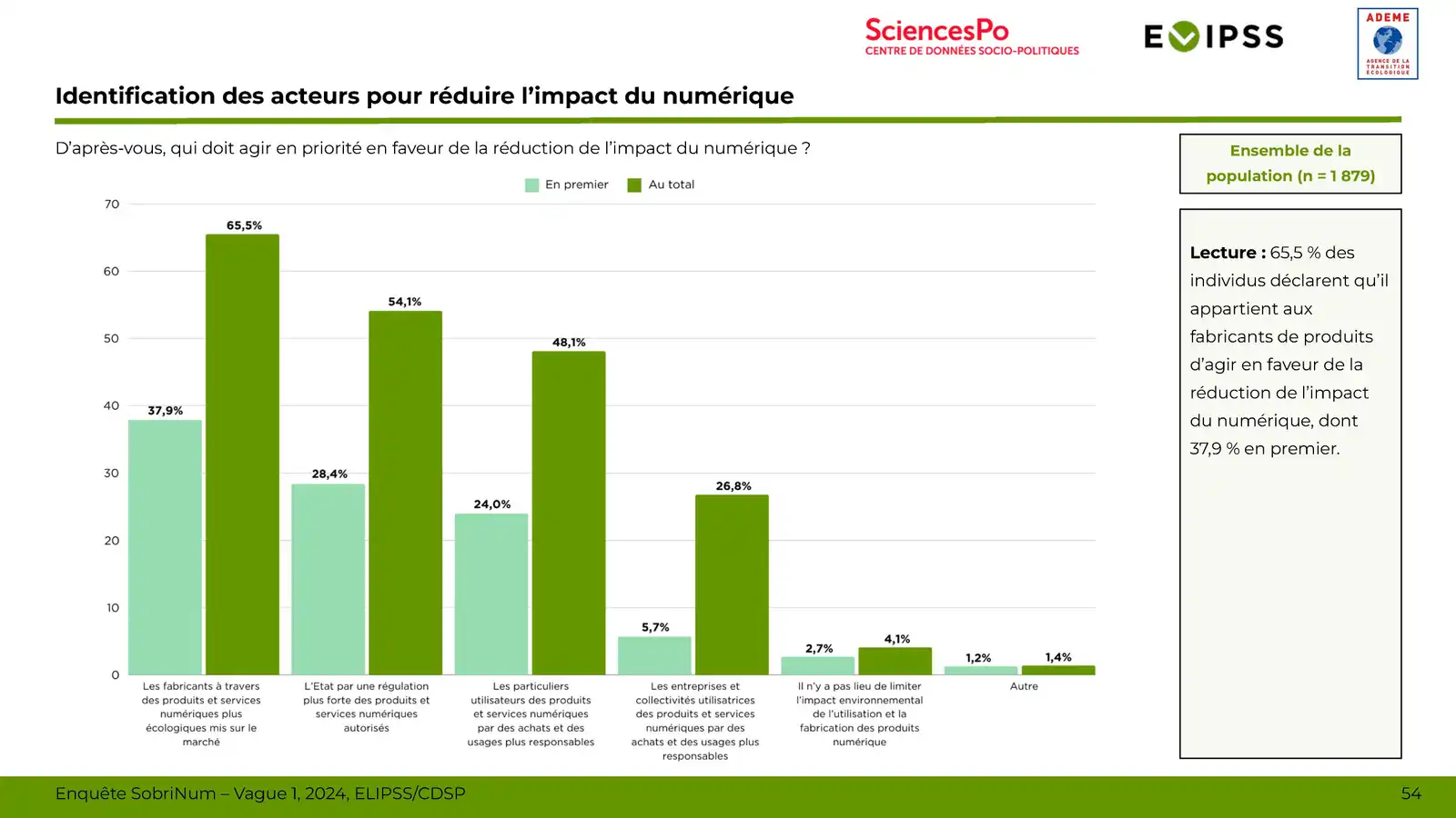 C’est pour y satisfaire que l’ADEME a conduit, en mai 2024, une enquête approfondie (SobriNum), en collaboration avec le CDSP dans le cadre du dispositif “Étude Longitudinale par Internet Pour les Sciences Sociales” (ELIPSS).