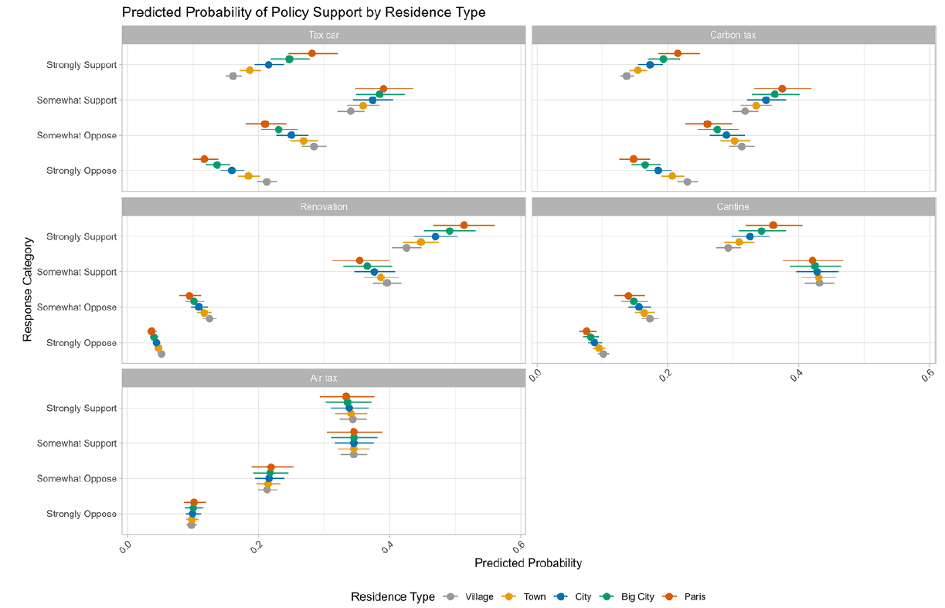 Ces graphiques présentent les probabilités de soutien à cinq politiques phares en matière d’action climatique, en fonction du lieu de résidence (village, ville petite, moyenne ou grande, et Paris). Tax car : taxe sur l’achat de véhicules thermiques ; Carbon tax : taxe sur les sources d’énergie émettrices de CO2 ; Renovation : obligation de rénovation énergéitque ; Cantine : introduction de menus végétariens dans les cantines ; Air tax : taxe sur le transport aérien.
