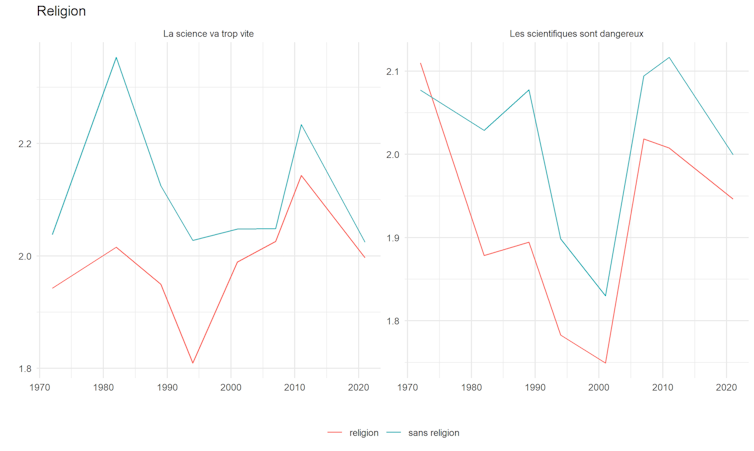 Graphique 1 : Évolution des attitudes antisciences (1972-2021) en fonction de la religion.