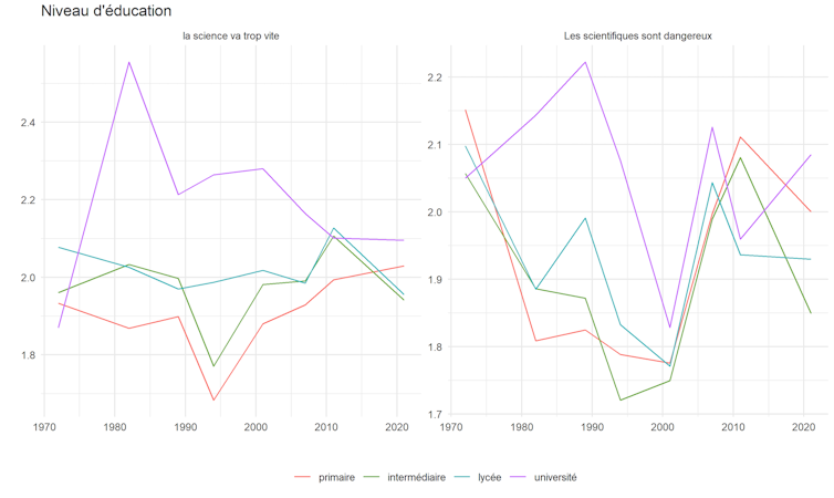 Graphique 2 : Évolution des attitudes antisciences (1972-2021) en fonction de l'éducation