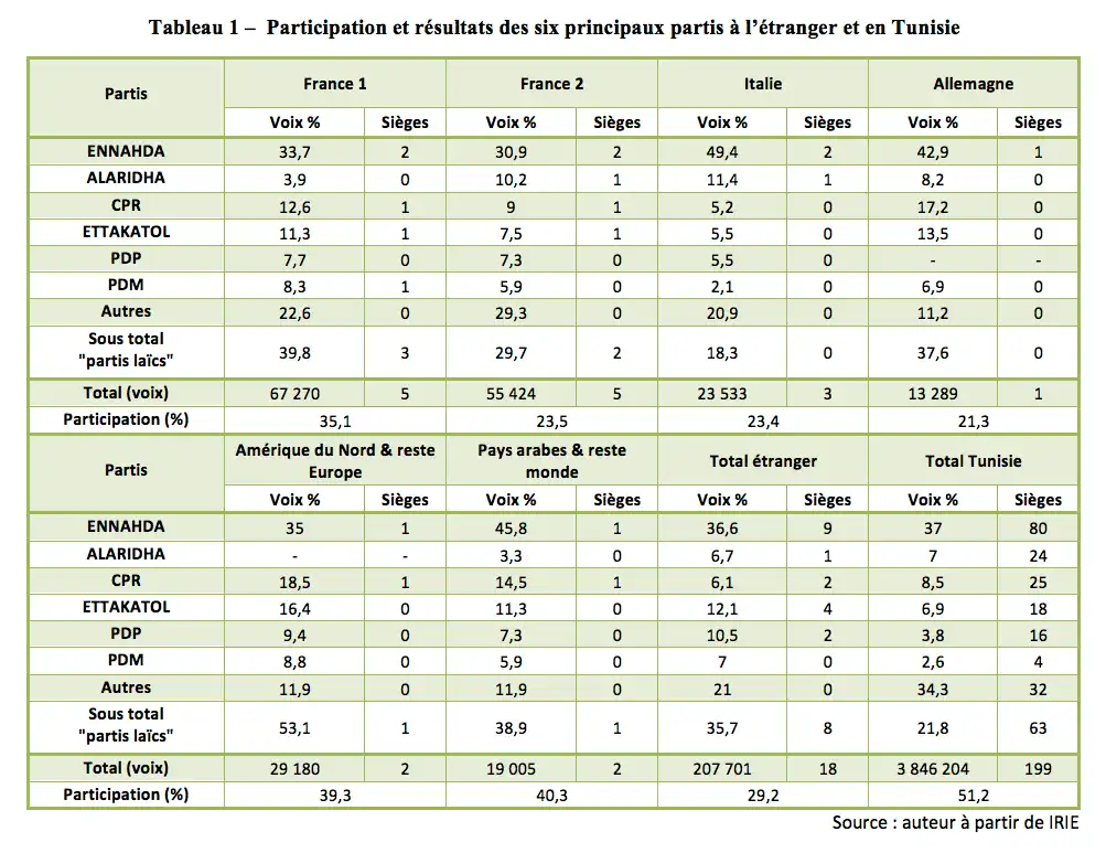 A l’étranger, les résultats des principaux partis laïcs ont été, en moyenne, nettement supérieurs à ceux de la Tunisie, tandis que le parti islamiste En-Nahda, vainqueur de l’élection, et le parti populiste Al-AridhaPétition populaire pour la liberté, la justice et le développement , arrivé quatrième, ont obtenu des scores presque identiques en Tunisie et à l’étranger. Toutefois, selon les circonscriptions, les résultats varient significativement. Par exemple, En-Nahda a réalisé un très bon score en Italie et un score plutôt faible dans la circonscription d’Amérique du Nord/reste de l’UE. Les résultats varient également entre les bureaux de vote au sein de chaque circonscription. Par exemple, dans la circonscription de France 1, les partis laïcs ont obtenu de très bons scores et En-Nahda un score relativement faible à Paris et dans les Hauts-de-Seine, à l’inverse des autres départements de l’Île-de-France, en particulier la Seine-Saint-Denis.