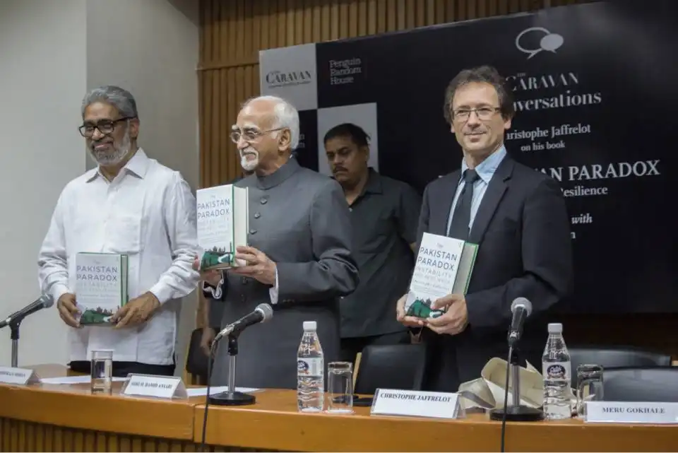 Photograph from the release of "The Pakistan Paradox" at the IIC, Delhi, with Vice President of India Mohammad Hamid Ansari (center), the journalist and academic Raja Mohan (left) and the author (right) :