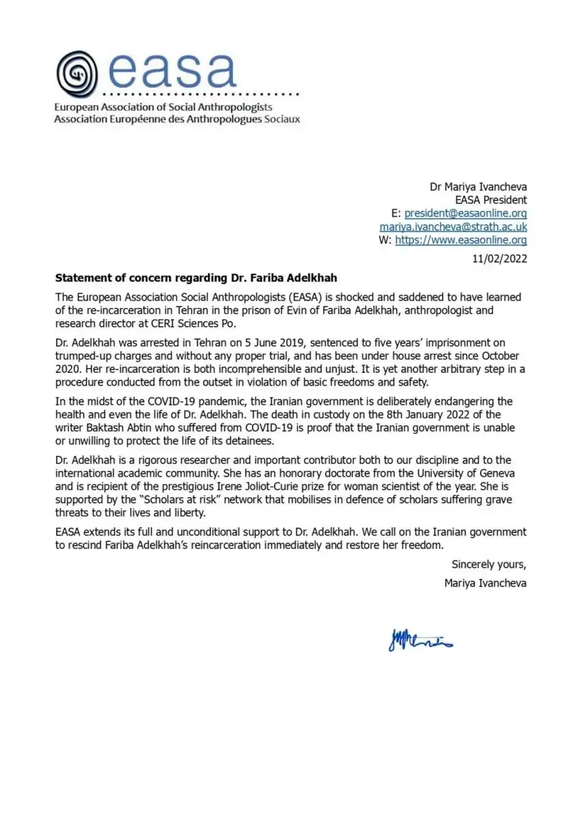 Februray 11, 2022 : EASA calls for the release of Dr. Fariba Adelkah