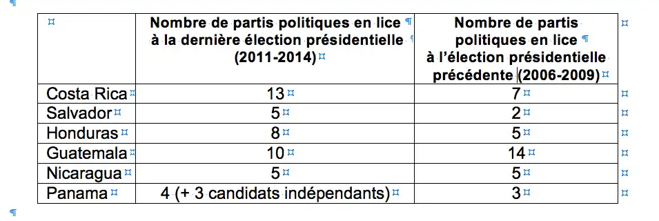 L’ouverture des échiquiers politiques nationaux et l’implosion du bipartisme dans chacun des Etats constituent des leçons majeures des élections organisées en Amérique centrale au cours des cinq dernières années.En termes d’ouverture du spectre politique, seul le Guatemala fait office d’exception avec une réduction du nombre de candidats à la Présidence (de 14 à 10 candidats). On atténuera cette exceptionnalité en indiquant que « l’univers partisan est caractérisé par une absence fondamentale de continuité »Sanchez Omar, « Party non-systems: A conceptual Innovation », Party Politics, 15 (4), 2009, pp. 487-520.. Sanchez qualifie même le système guatémaltèque de « non-système partisan »Ib. . Mis à part ce pays, on observe une augmentation nette du nombre de candidats présidentiels pour l’ensemble des Etats de la région.