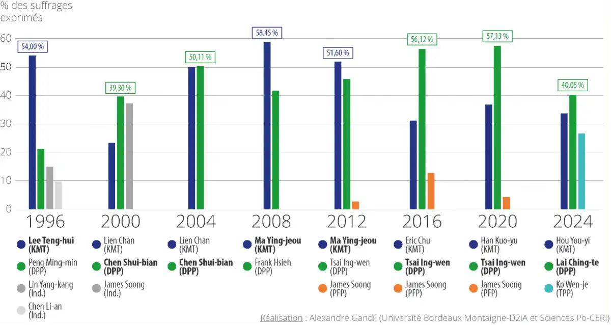Dans une élection à un seul tour, c’est le vice-Président sortant, Lai Ching-te du Parti démocrate progressiste (Minjingdang, 民進黨, DPP), qui a remporté le scrutin avec une majorité relative de 40,05%, contre 33,49% pour Hou You-yi du Parti nationaliste (Guomindang, 國民黨, KMT) et 26,46% pour un outsider, Ko Wen-je qui a fondé son parti en 2019, le Taiwan People’s Party (Taiwan minzhong dang, 台灣民眾黨, TPP).