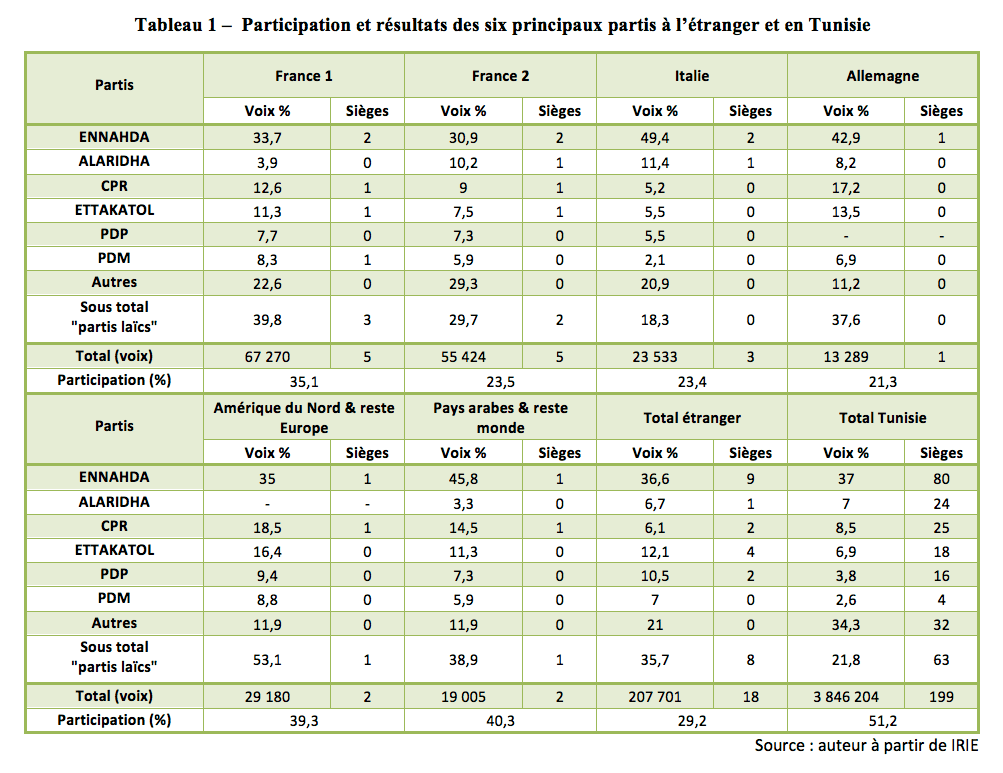 Au niveau global, les quatre principaux partis laïcs (CPR, Ettakatol, PDM, PDP(15)) obtiennent un score nettement supérieur à leur score en Tunisie (tableau 1). Cette différence ne s’explique pas par un contre-résultat d’En-Nahda et d’Al-Aridha, qui réalisent un score similaire à l’étranger et en Tunisie, mais par une moindre dispersion des voix à l’étranger qui profite exclusivement aux partis laïcs. La préférence des électeurs à l’étranger pour les grands partis peut s’expliquer par une moins bonne connaissance du champ politique postrévolutionnaire due, en partie, à la faible représentation des petits partis dans les médias satellitaires et au manque de moyens pour faire campagne à l’étranger.