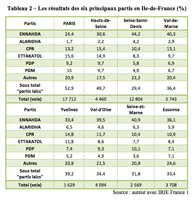 A l’étranger, les résultats des principaux partis laïcs ont été, en moyenne, nettement supérieurs à ceux de la Tunisie, tandis que le parti islamiste En-Nahda, vainqueur de l’élection, et le parti populiste Al-Aridha(3), arrivé quatrième, ont obtenu des scores presque identiques en Tunisie et à l’étranger. Toutefois, selon les circonscriptions, les résultats varient significativement. Par exemple, En-Nahda a réalisé un très bon score en Italie et un score plutôt faible dans la circonscription d’Amérique du Nord/reste de l’UE. Les résultats varient également entre les bureaux de vote au sein de chaque circonscription. Par exemple, dans la circonscription de France 1, les partis laïcs ont obtenu de très bons scores et En-Nahda un score relativement faible à Paris et dans les Hauts-de-Seine, à l’inverse des autres départements de l’Île-de-France, en particulier la Seine-Saint-Denis.