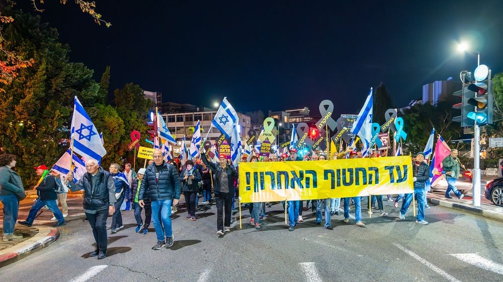 Photo 1 : Haïfa, 25 janvier 2025 : Des personnes arborent des pancartes et des drapeaux et participent à un rassemblement pour demander la fin de la guerre, l'achèvement de la prise d'otages et de nouvelles élections. Crédit RnDmS pour Shutterstock.