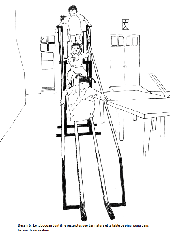 Photo 4 : Pendant les vacances, la cour de l'école est vide. Des enfants en profitent pour venir jouer sur le toboggan, dont il ne reste plus que l'armature. A droite, une table de ping pong de récupération et son filet, constitué d'une barre en bois. Dessin d'après photo de l'auteur (p. 113).