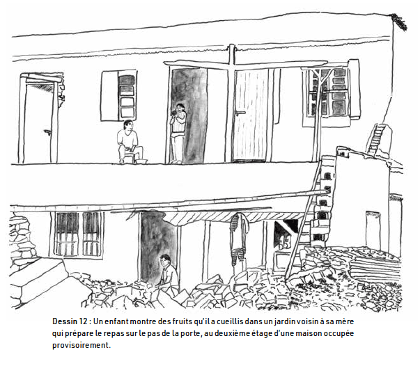Photo 2 : Maison provisoire d'un des enquêtés, au milieu des remblais du quartier en destruction. A l'étage, un enfant et sa mère, en bas une femme qui prépare le repas sur le pas de la porte. Dessin d'après photo de l'auteur (p 227).