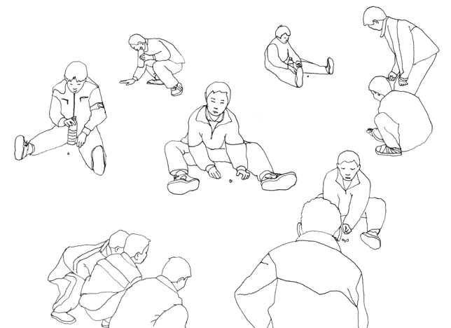 Photo 3 : Anthropologie des "techniques du corps" : les postures des enfants pour jouer aux billes. Dessins d'Amandine Salgues, d'après des photos de l'auteur (p. 151).
