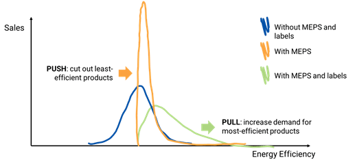 Both eco-design and energy labeling aim to transform the EU market for energy-related products. The theoretical effects, that the policy mix aims at, can be explained using market transformation theory(6): The MEPS under the eco-design directive act as a market push-factor, by cutting out least efficient products. The energy labels then act as a market pull-factor, by increasing the demand for most-efficient products.