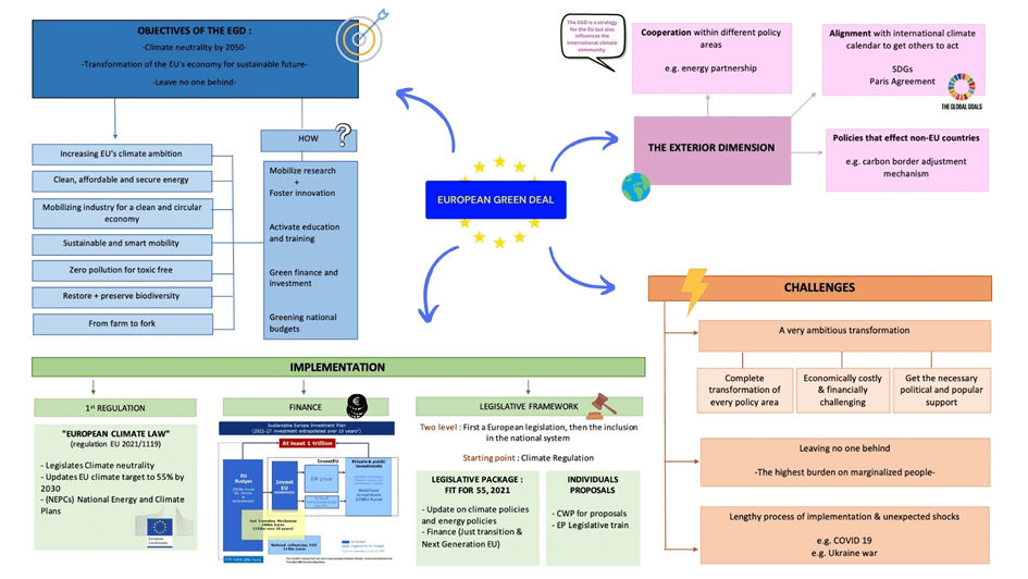 The European Green Deal (EGD) is an ambitious policy initiative set by the European Commission, approved in 2020 and aiming for climate neutrality in Europe by 2050. The EGD requires an entire transformation in all European economies and societies while not leaving anyone behind. This ambitious project presents a lot of financial, social and political challenges that the EU will need to face to create a more sustainable future in Europe and worldwide. The success of the EGD depends on the commitment of the member states and the success of the implementation period on the EU level as well as the national level.