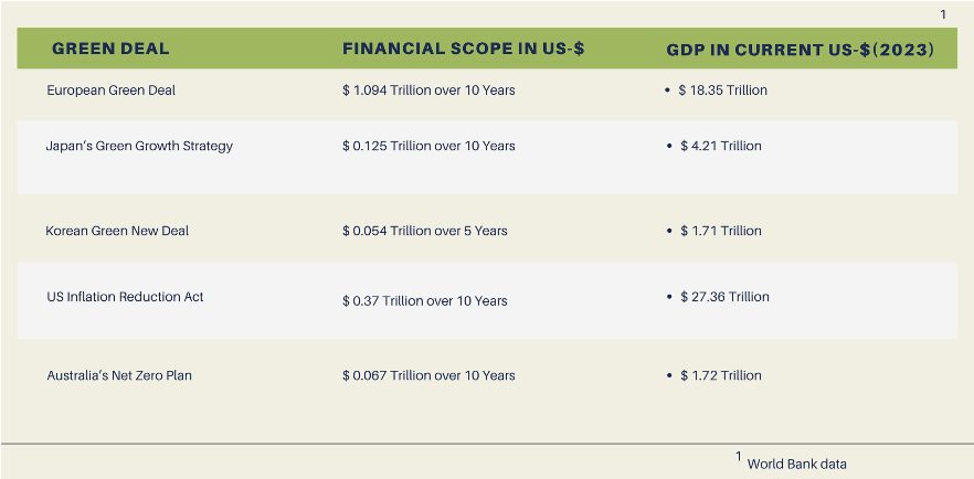 To assess the scope of the other Green Deals, more calculation is required. While the Korean Green New Deal amounts to KRW 73.4 trillion (KRW 42.7 trillion from the treasury) over 5 years [22][28], the Australian government speaks of an AUD 20 billion investment over the next decade, unlocking a further AUD 80 billion of private and public investment [24]. In the Japanese case, the government will invest JPY 2 trillion in a Green Innovation Fund over 10 years, to stimulate JPY 15 trillion of private R&D and investment. Furthermore, a tax initiative should stimulate another JPY 1.7 trillion of private investment [21]. If the different sums are added up for each country and then converted into USD, the following picture emerges: