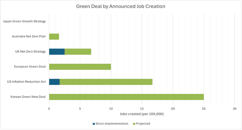 A key aim of the EGD is to “leave no one behind” [1], funded through components such as the Just Transition Mechanism and the Social Climate Fund, with around 17% of its EUR 1 trillion investment target explicitly dedicated to social policies [26]. Yet, among the Green Deals analysed, only the Korean Green New Deal places a strong emphasis on reskilling for vulnerable communities. However, it lacks the scale and specificity of dedicated funds comparable to those of the EGD. The British and Australian strategies focus on broader job creation and upskilling within green sectors but without a targeted social equity framework. Japan’s Green Growth Strategy, meanwhile, centres on industrial transformation, with job creation as a secondary outcome rather than a primary social objective. On a comparable note, it is worth mentioning that the IRA’s precursor, the Green New Deal, had it passed in the US Senate, would have been the most comprehensive Green Deal on social matters. It very explicitly made the point that a Green Deal needs not only to protect those whose jobs will be lost to the green transition but to protect those most likely to be suffering the consequences of climate change itself, even going as far as to advocate for the need to “promote justice and equity by stopping current, preventing future and repairing historic oppression” [30].