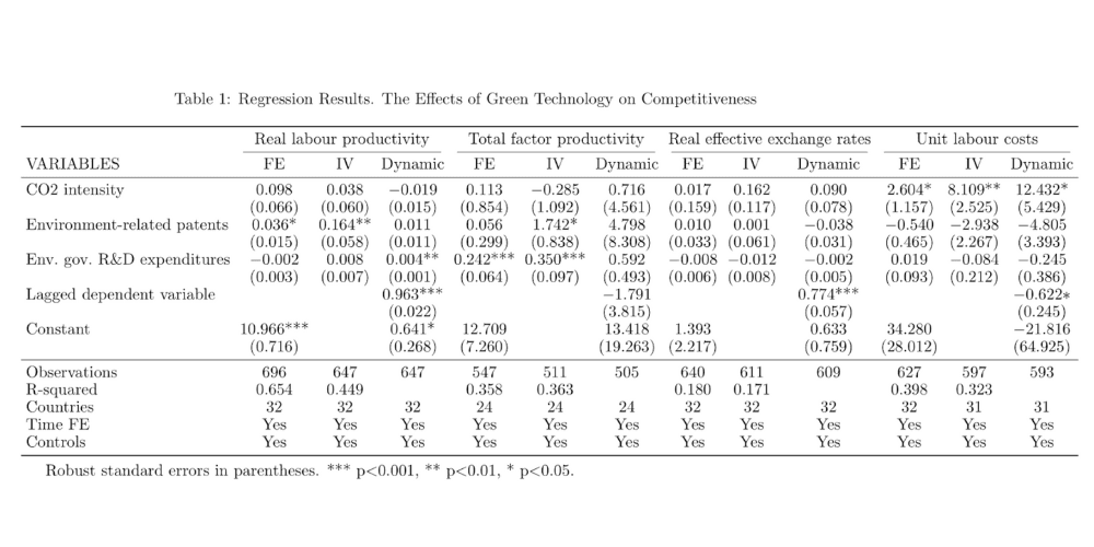 So, what does the data tell us? To examine the effect of green technology on competitiveness, a country-level panel dataset was assembled, covering 32 European and other economies during 1990-2022. To distinguish between different dimensions of competitiveness, both productivity competitiveness (proxied by labour productivity and total factor productivity) and price competitiveness (proxied by real effective exchange rates and unit labour costs) were analysed. The effect induced by green regulation was proxied by production-based CO2 intensity, environment-related patents, as well as environment-related government R&D expenditures. The analysis employed several regression techniques including fixed effects (FE), instrumental variable (IV) and dynamic panel models. Rich controls were also included to account for potential confounding factors.