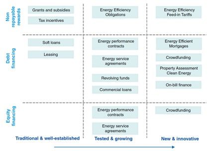 The European Commission estimates a gap in investments in energy efficiency (EE) to achieve its set targets of around €165 billion (European Commission, 2021a). This lack of investment is due to various reasons, including the perception of high upfront costs, lack of awareness and information, and various market and regulatory barriers. Numerous financial instruments are being used to try to close this gap and help overcome these barriers. Such instruments can be divided into three types depending on their market saturation in Europeas done in Figure 1 (Bertoldi et. al., 2020). There are traditional financing instruments such as grants, subsidies, tax incentives, and loans. These have already been operating for several decades across many EU Member States. However, due to the persistent investment gap, these are arguably not sufficient on their own to bridge it. Next, there are tested and growing instruments such as energy performance contracts and energy service agreements. These have been proven to work in several EU Member States, and are becoming increasingly significant in scale with more widespread applications. Lastly, there are new and innovative schemes, that have little to no application in the EU so far but haveoften already been tried out in other parts of the world. These instruments hold the potential to improve EE financing and tackle problems that traditional and growing ones cannot. I will focus on these innovative financing schemes in this paper. Due to the limited scope of the paper, I will discuss two innovative schemes in particular: on-bill and on-tax financing schemes.
