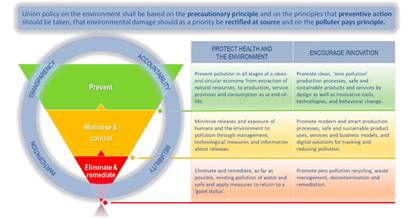 The most important pillar of the EU’s environmental policies is prevention at the source (in all stages of the circular economy) based on the precautionary principle. The precautionary principle enables decision-makers to adopt precautionary measures when scientific evidence about an environmental or human health hazard is uncertain and the stakes are high. It first emerged during the 1970s and has since been enshrined in several international treaties on the environment, in the TFEU (Article 192) and the national legislation of certain Member States. The ‘polluter pays’ principle (enshrined in Article 191 TFEU) is the commonly accepted practice that those who produce pollution should bear the costs of managing it to prevent damage to human health or the environment. Both concepts are important in global environmental governance, as not all countries abide by these principles and therefore, they remain a point of contention.