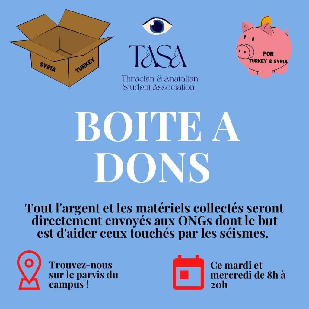 TASA is an association of Sciences Po students whose initial goal is to promote the Thracian and Anatolian cultures. Some students are directly concerned by this tragedy since there are about twenty Turkish and Syrian students currently on the Menton campus.