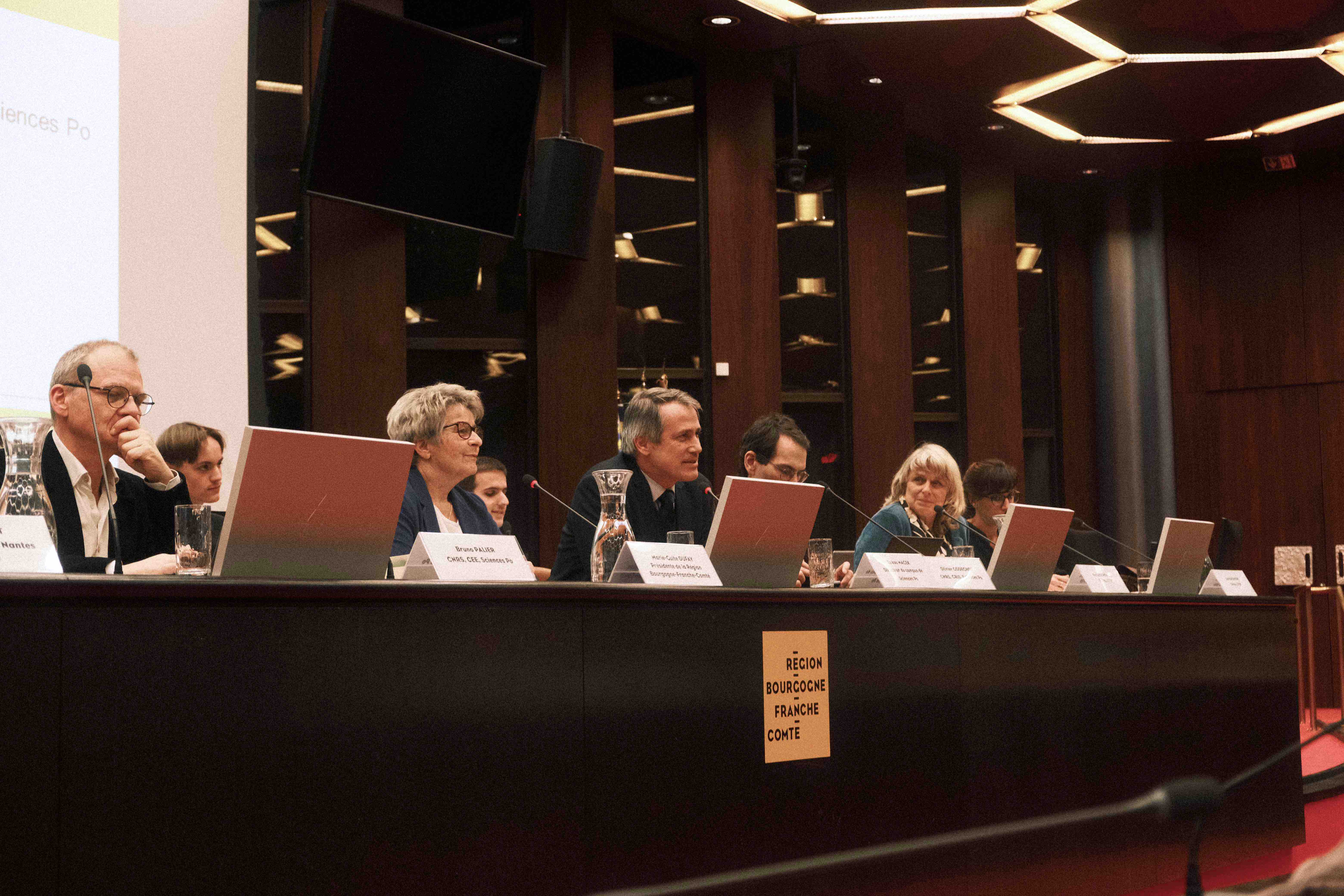 La conférence avait lieu dans la salle du conseil de la région Bourgogne-Franche-Comté, un site emblématique de Dijon et de sa région. Sur les bancs habituels des élus régionaux, se trouvaient des étudiants de Sciences Po, des syndicalistes, des élus, les vice-présidentes de la région ainsi que quelques curieux… tous venus tendre l’oreille et poser leurs questions aux chercheurs.