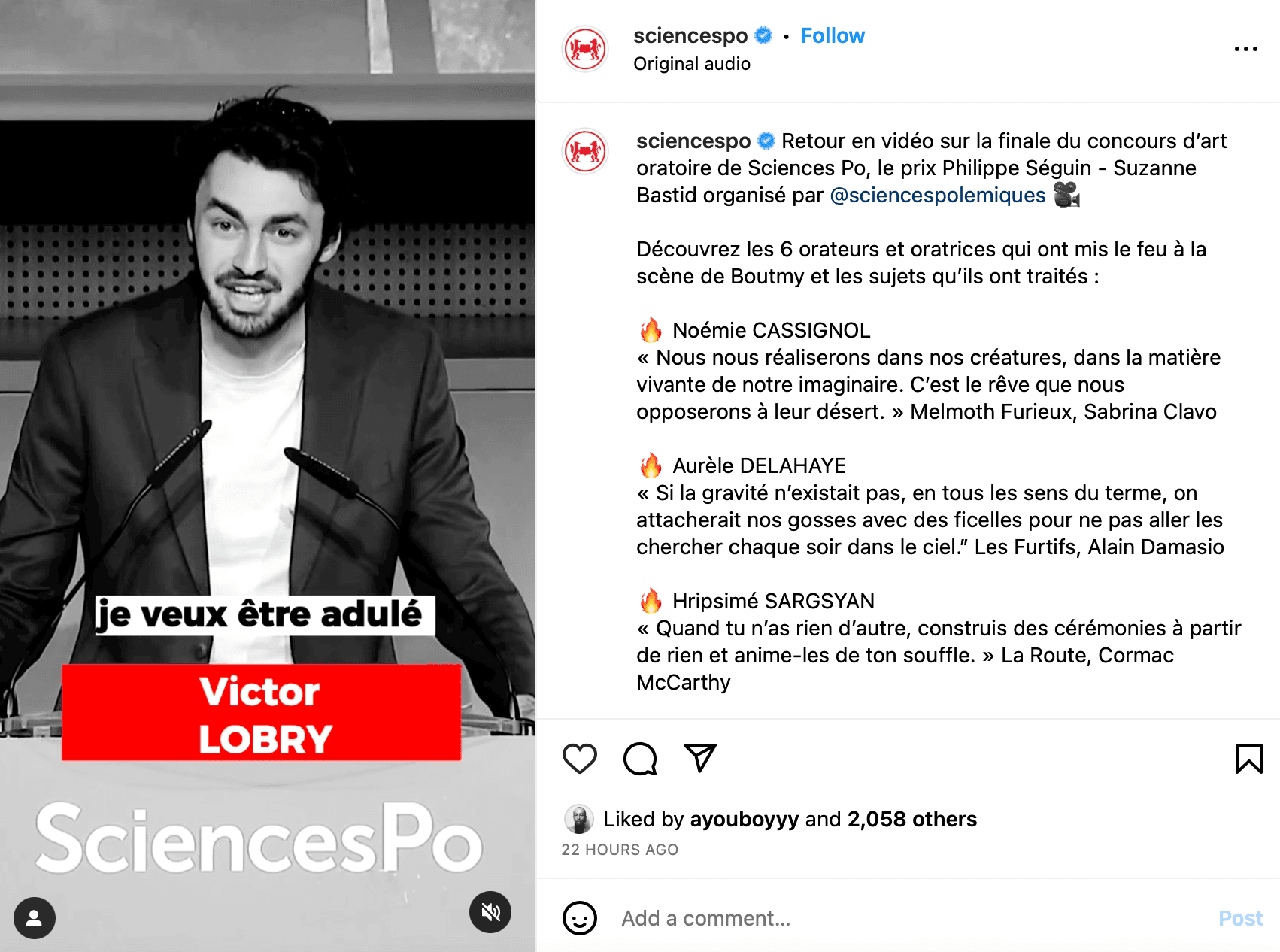 Le concours d'éloquence, un des moments forts de l'année étudiante et l'une des marques de fabrique de Sciences Po, est organisé par l'association d'art oratoire Sciences Polémiques. Une association qui ne s'est pas reposée sur sa renommée cette année et qui a tenu un gala d'art oratoire à l'occasion des 150 ans de Sciences Po (à retrouver ici en vidéo) et ouvert une filiale sur le campus du Havre, ouverture marquée par la première édition du prix d'éloquence Richard Descoings.