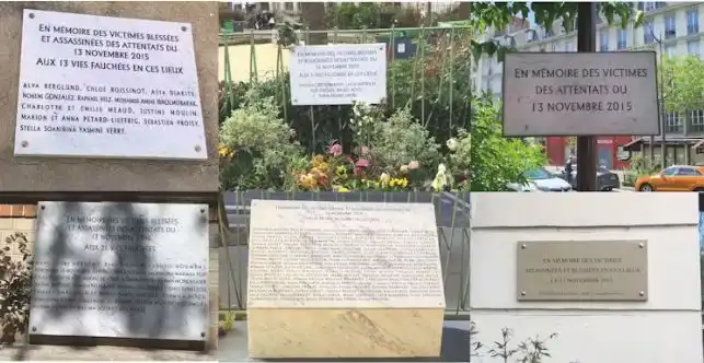 The rest of these plaques refer to attacks in January, 2015 (11th and 12th arrondissements), and, above all, November 2015 (10th and 11th arrondissements), with the exception of those commemorating the attack that killed Xavier Jugelé on April 20, 2017 on the Champs-Élysées (8th arrondissement), and the attack that killed Ronan Gosnet on May 12, 2018 on rue Marsollier (2nd arrondissement).