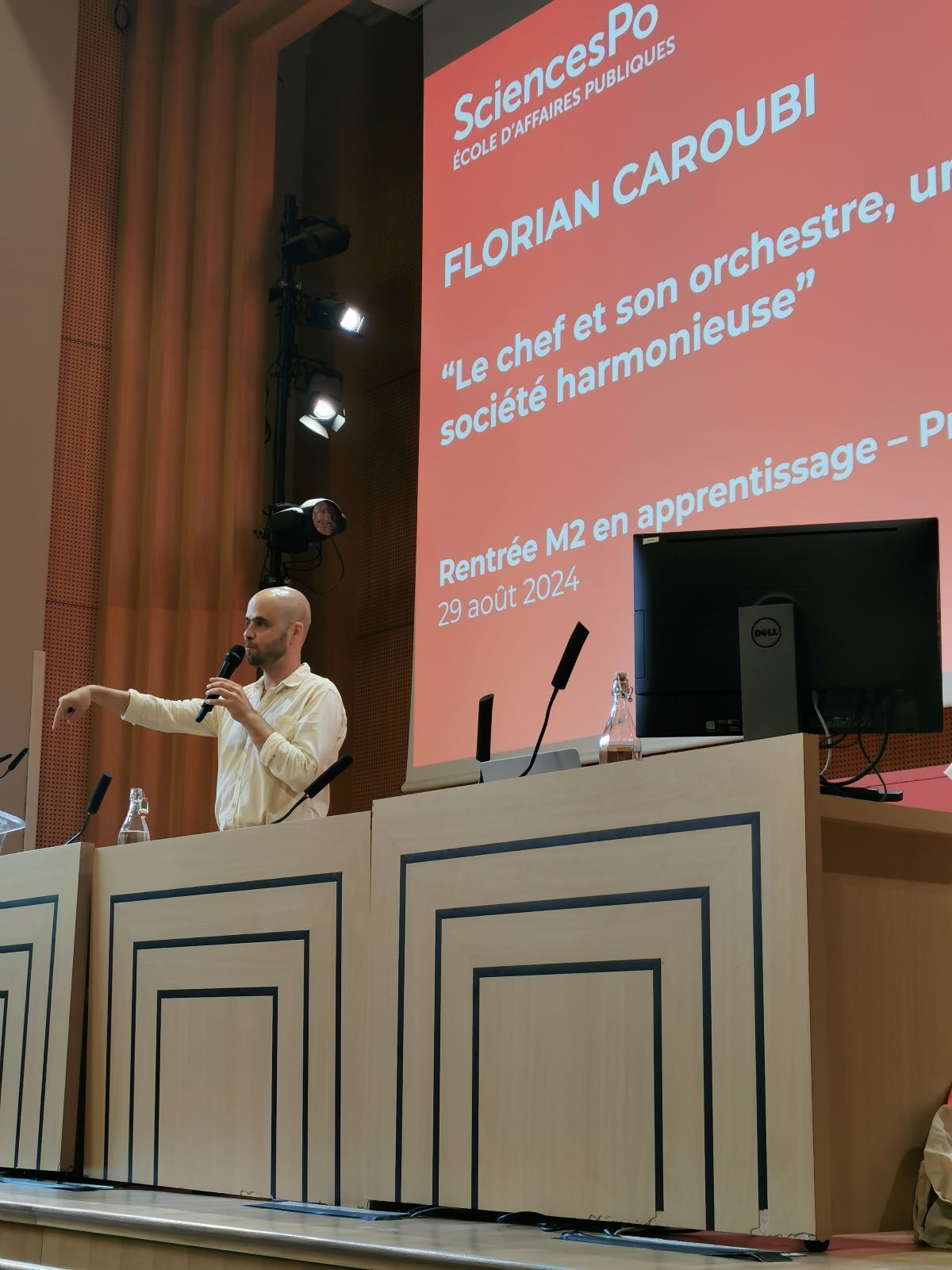 Jeudi 29 août et vendredi 30 août 2024, dans le cadre de leurs journées de rentrée, les apprentis ont d’abord rencontré Florian Caroubi, chef d’orchestre et pianiste, professeur aux conservatoires nationaux supérieurs de musique et de danse de Lyon et de Paris. Sa conférence intitulée "Le chef et son orchestre, une analogie pour une société harmonieuse" visait, en nous faisant entrer dans les coulisses d’un orchestre, à établir des parallèles féconds entre la position du chef d’orchestre et celle du manager. Ses propos ont résonné avec les expériences des apprentis en stage et résonneront cette année dans leurs relations avec leur manager ou, plus tard, dans leur propre position à la tête d’une équipe. La musique de Gustav Mahler dans l’amphithéâtre Émile Boutmy restera un temps fort de cette rentrée !