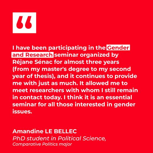 The Genre et recherche seminar, directed by Réjane Sénac, CNRS research director at the CEVIPOF-Sciences Po, is part of Sciences Po's gender studies programme. Its aim is to create a think-tank and research group around the work of doctoral students, as well as Master 1 and 2 students, who are explicitly involved in so-called gender studies or for whom the issue of equality policies is illuminating. The aim is for different disciplines to engage in dialogue around common themes or questions (methodological issues, identity and equality politics, the fight against discrimination, intersectionality, sexuality, politicisation, mobilisation, etc.).