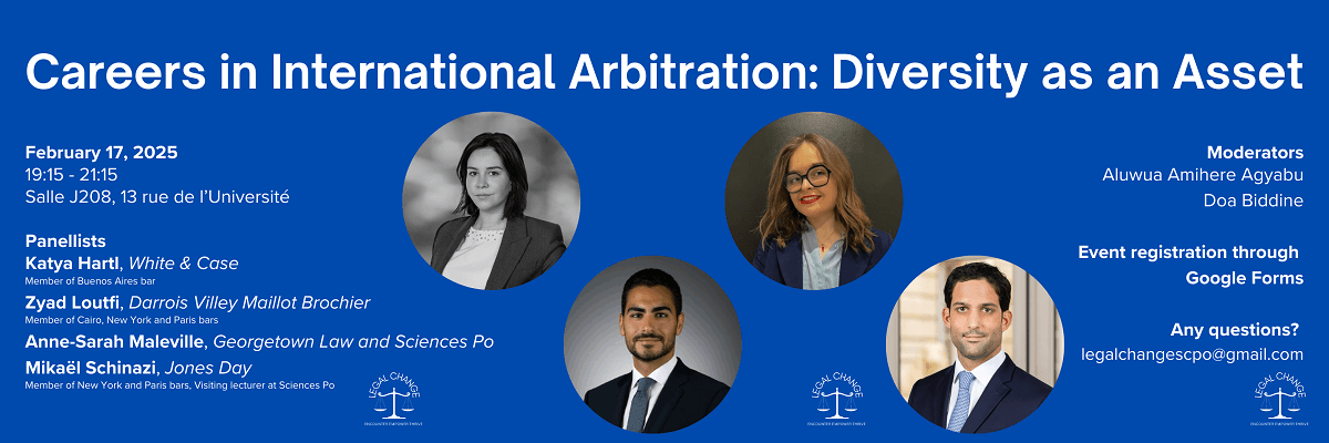 Legal Change is thrilled to invite you to an exclusive panel discussion: “Career in International Arbitration: Diversity as an Asset”, taking place on Monday, February 17, at 7:15 PM (Room J208, 13 rue de l’Université).