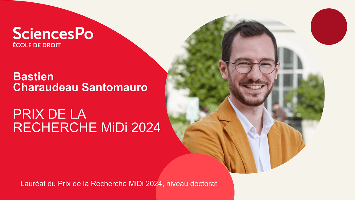 Bastien Charaudeau Santomauro, doctorant à l'École de droit de Sciences Po, a reçu le Prix de la recherche MiDi 2024 attribué par le collectif interdisciplinaire Migration et Diversité (MiDi) de Sciences Po pour son article La frontière étatique, terme de l’aide humanitaire ? Une analyse du droit en action (revue Criminologie, novembre 2024).