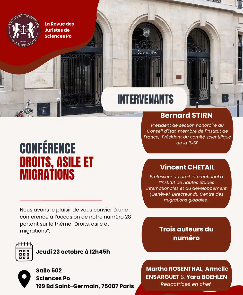 La Revue des juristes de Sciences Po a le plaisir de vous inviter à la conférence de lancement du numéro 28 de sa revue, consacré au thème « Droits, asile et migrations ».