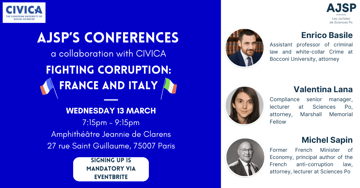 The Association des Juristes de Sciences Po (AJSP) is delighted to invite you to a conference on ways to fight corruption in France and Italy on March 13th at 7:15pm, in the Amphithéâtre Jeannie de Clarens, 27 rue Saint-Guillaume.