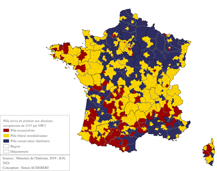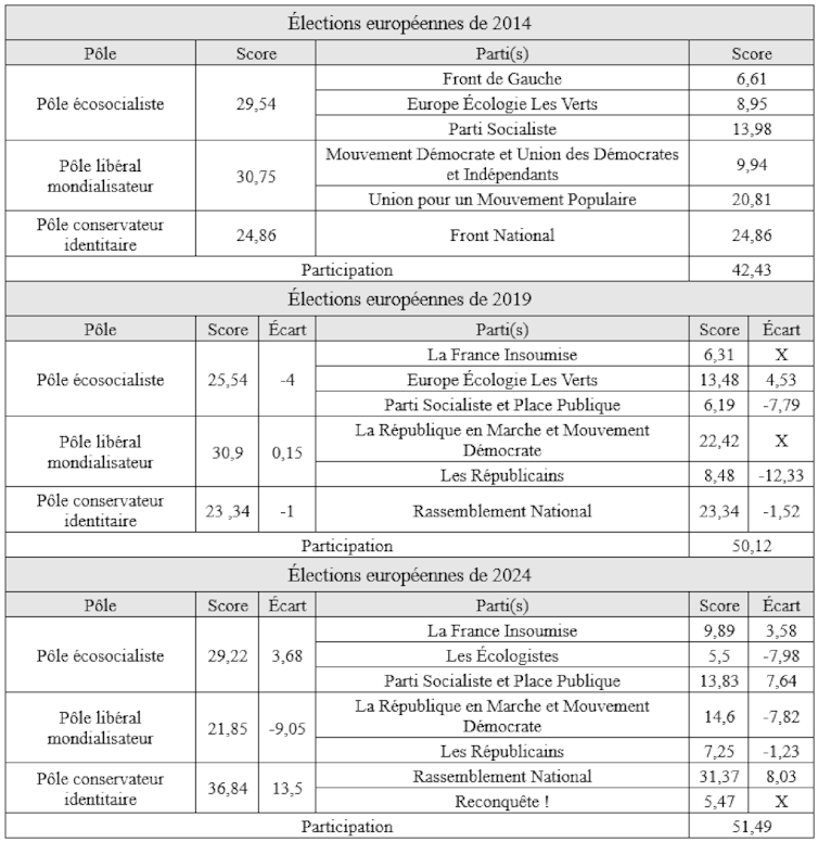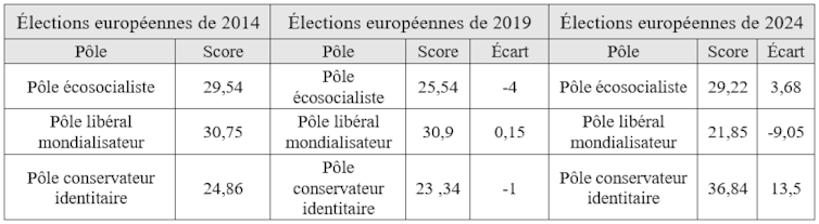 Le pôle conservateur-identitaire s’oppose à la mondialisation dans toutes ses dimensions et affiche des attitudes autoritaires et xénophobes, favorables à l’ordre et hostiles à l’immigration. Il se situe à droite et à l’extrême droite, principalement représenté par le Rassemblement national et Reconquête. Le pôle libéral-mondialisateur, incarné par le parti présidentiel Renaissance et ses alliés, est marqué par une volonté de poursuivre la mondialisation et le libéralisme économique.