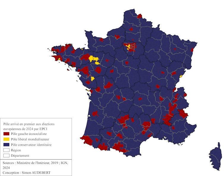 Les élections de 2024 sont principalement marquées par la baisse du pôle libéral-mondialisateur, qui disparaît presque de la carte des pôles arrivés en tête dans les EPCI, au profit notamment d’un vote pour le pôle conservateur-identitaire, qui progresse de 13,5 %. C’est par exemple le cas dans la Loire ou le Cantal, où le pôle libéral-mondialisateur arrivait en tête dans l’ensemble des EPCI en 2019, et dans lesquels l’extrême droite arrive en tête partout en 2024.