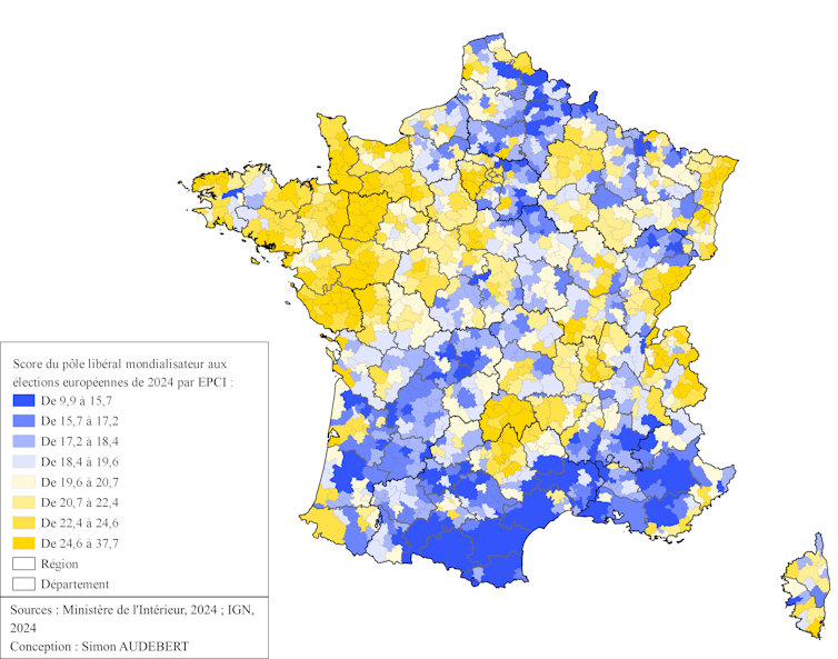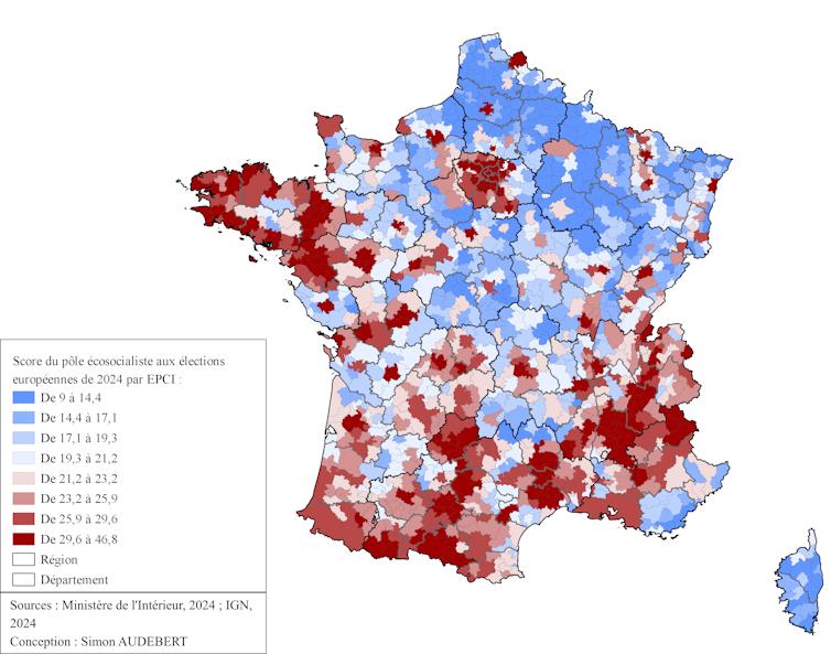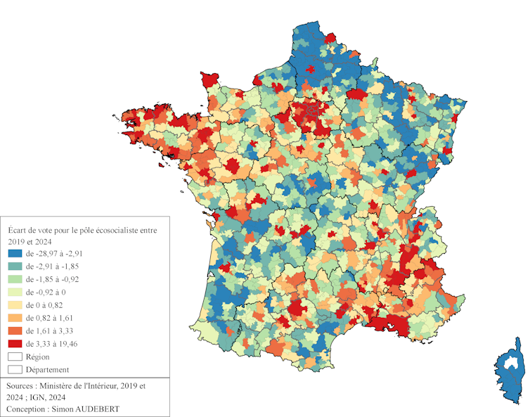 Comme le montre la carte de la progression du vote écosocialiste, cela s’explique aussi par un recul de ce vote dans un certain nombre de territoires ruraux, notamment ceux acquis à l’extrême droite dans le nord et l’est de la France principalement.