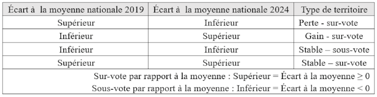Une analyse des écarts à la moyenne permet d’identifier les territoires les plus favorables à chacun des trois pôles. Nous réalisons cette analyse avec une typologie originale faisant apparaître quatre types de territoires : les territoires où l’on vote systématiquement moins pour l’un ou l’autre des pôles que sur le territoire national ; les territoires où l’on vote systématiquement plus pour l’un ou l’autre des pôles ; les territoires où l’on a sous-voté pour un des pôles en 2019 et sur-voté en 2024 ; les territoires où l’on a sur-voté pour un des pôles en 2019 par rapport à la moyenne nationale et sous-voté en 2024.
