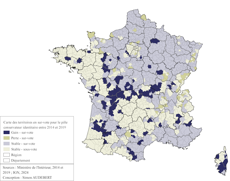 La place des territoires « gagnés », au sens où ils présentent un sur-vote par rapport à la moyenne nationale en 2024 alors qu’ils ne le faisaient pas en 2019, permet de tirer des premiers éléments d’analyse pour les élections législatives prévues pour le 30 juin.
