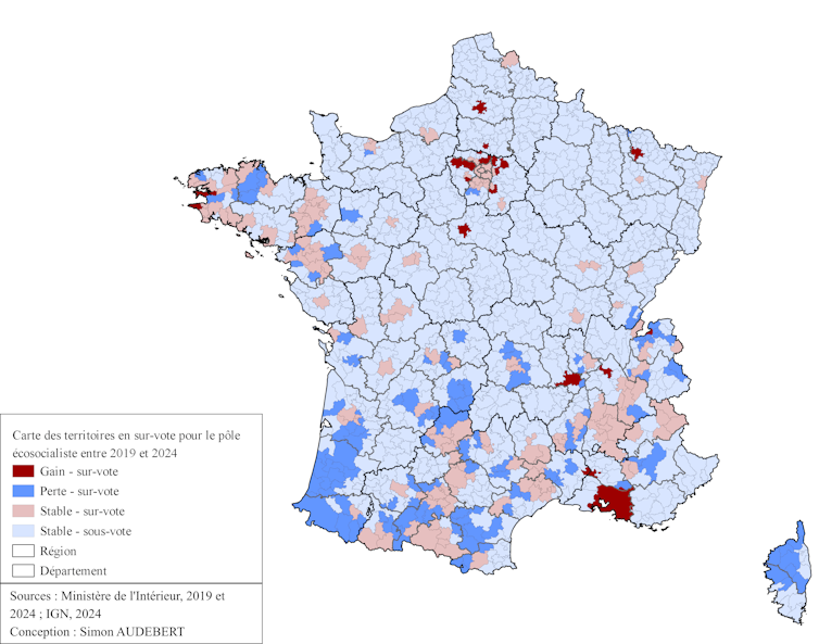 La carte des territoires en sur-vote pour le pôle écosocialiste en 2024 ainsi que celle de sa progression en comparaison à 2019 nous permet de tirer plusieurs éléments d’analyse de la structure territoriale de ce pôle.