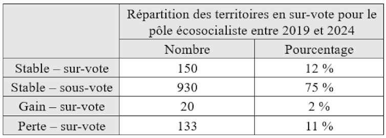 Le pôle écosocialiste réalise des scores importants dans les grands centres urbains ce qui a tendance à augmenter sa moyenne au niveau national et à expliquer, en partie, le nombre de territoires en sous-vote par rapport à la moyenne nationale lors des élections de 2019 et 2024.